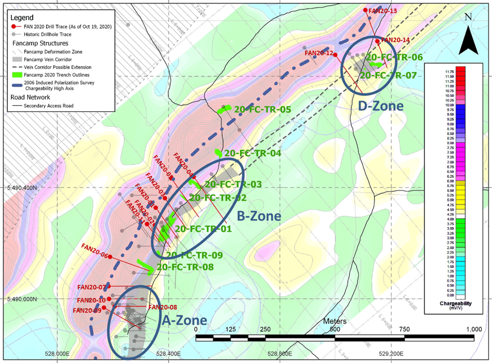 Figure 1: Trenches, Drill Holes, Vein Trends and Historical IP (Chargeability) Anomalies – Fancamp A-, B-, and D-zones