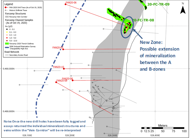 A total of 9 trenches were excavated at the Fancamp property. Three of these were excavated over the known historical vein trend at the A-, B- and D-zones and the remaining six were excavated outside of the main vein trend, testing historical geophysical (induced polarization/resistivity “IP”) anomalies and interpreted structural targets (Figures 1 to 4). From these trenches, 594 saw-cut channel chip samples were collected over lengths ranging from 0.15 m to 2.0 m, but generally averaging around 1.0 m. In addition, 34 grab samples were collected. Gold assays have been returned for all of the trench samples; however, multi-element ICP analyses, which will provide base metal and other precious- and pathfinder-element concentrations are pending.