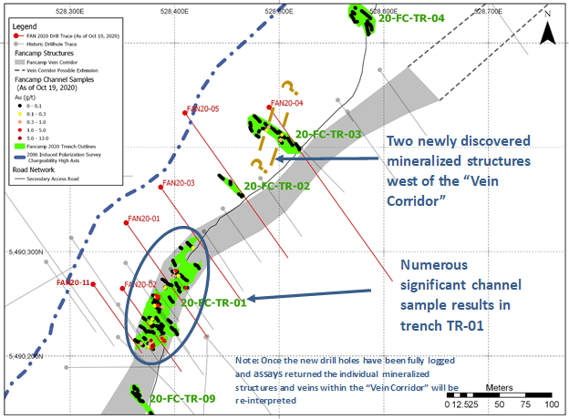 Additional trenches have been completed by the Company at the D-Zone and over a large chargeability anomaly that lies just west of, and parallel to the “vein corridor”, based on interpretations of an historic induced polarization survey. Field crews also completed property-scale prospecting at Fancamp.